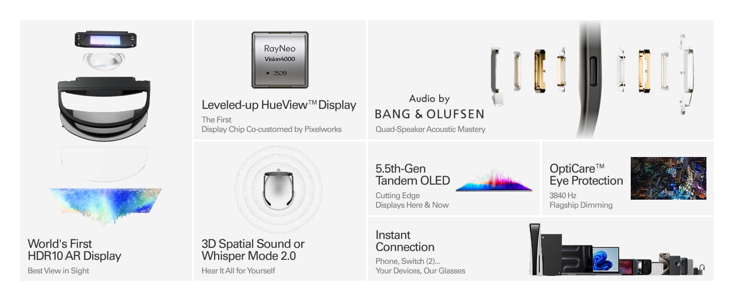 - World's first HDR10 AR Display: Experience 10B+ colors, surpassing standard displays. Enjoy deep contrast on a 201" HueView™ 2.0 screen.